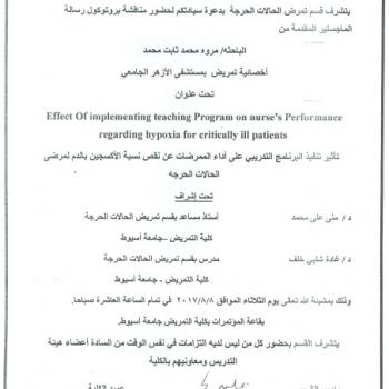 By God willing, the protocol of master thesis submitted by researcher/ Marwa Mohamed Thabet Mohamed – Nursing Specialist, will be discussed on Tuesday, 8/8/2017, at 10:00 a.m., at the conference hall…