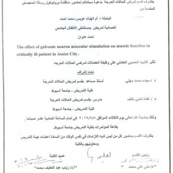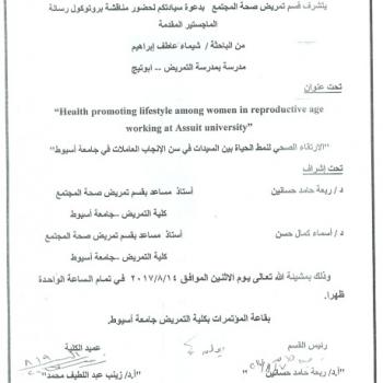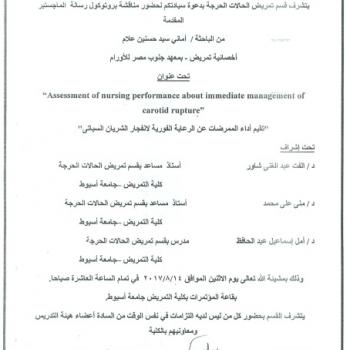 By God willing, the protocol of master thesis submitted by researcher/ Amany Sayed Hassanein Allam – Nursing Specialist, will be discussed on Monday, 14/8/2017, at 10:00 a.m., at the conference hall…