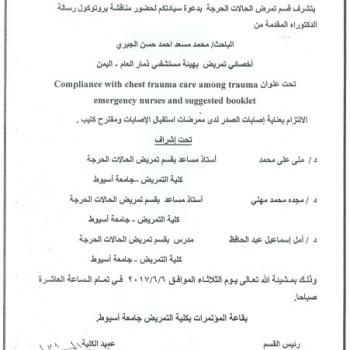 By God willing, the protocol of doctoral thesis submitted by researcher/ Mohamed Mossad Ahmed Hassan El-Gabry – Nursing Specialist, Thamar Hospital, Yemen, will be discussed on Tuesday, 6/6/2017, at…