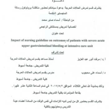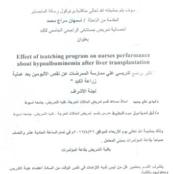 By God willing, the protocol of master thesis submitted by researcher/ Asmaa Saber Mohamed – Nursing Specialist, will be discussed on Tuesday, 2/5/2017, at the conference hall of the college.