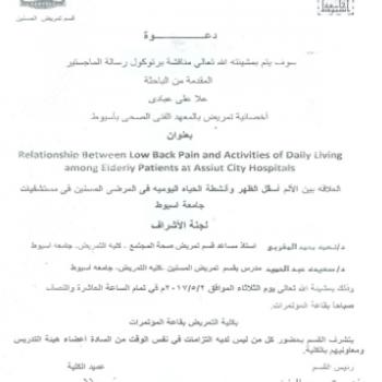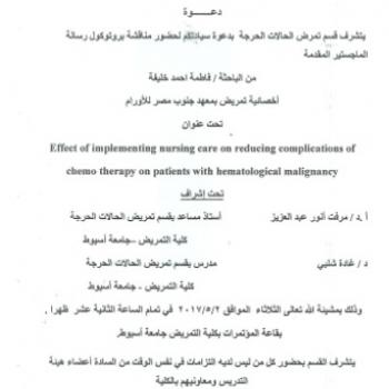 By God willing, the protocol of master thesis submitted by researcher/ Fatma Ahmed Khalifa – Nursing Specialist, will be discussed on Tuesday, 2/5/2017, at the conference hall of the college.