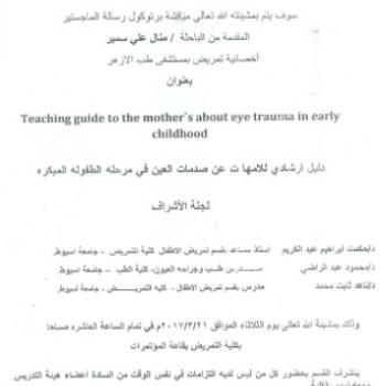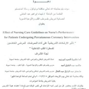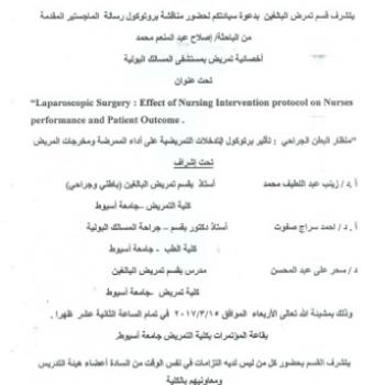 By God willing, the protocol of master thesis submitted by researcher/ Eslah Abdel-Monaim Mohamed– Nursing Specialist, will be discussed on Wednesday, 16/3/2017, at 12:00 noon, at the conference hall…