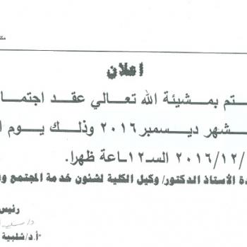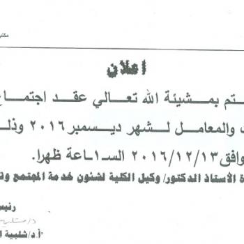 By God willing, meeting of critical care nursing department council chaired by Prof. Dr./ Zainab Abdul Latif Mohammed, Faculty Dean, will be held on Tuesday, 13/12/2016, in the presence of teaching…
