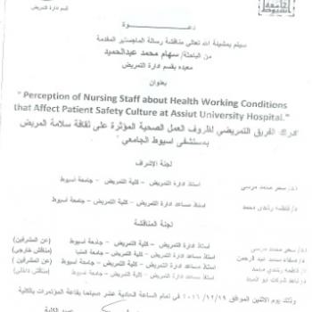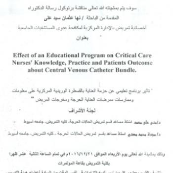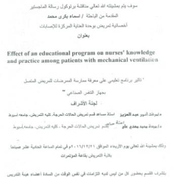 By God willing, The protocol of master thesis submitted by researcher/ Asmaa Bakry Mohamed, Nursing Specialist, will be discussed on Wednesday, 21/12/2016, at 11:00 a.m., at the conference hall of…