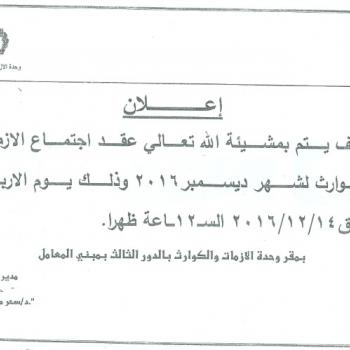 By God willing, meeting of crises and disasters committee chaired by Prof. Dr./ Sahar Mohamed Morsy will be held on Wednesday, 14/12/2016, at 12:00 noon, at Faculty of Nursing - Assiut University…