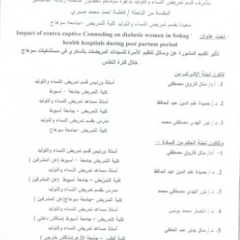 By God willing, master thesis submitted by researcher/ Fatma Ahmed Mohamed Sabry - demonstrator, Gynecology and Obstetrics Nursing department, Faculty of Nursing, Sohag University - will be discussed…