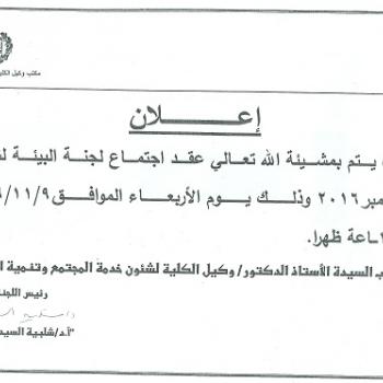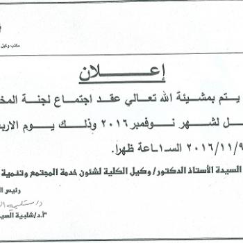 By God willing, meeting of career's ethics committee chaired by Prof. Dr./ Zainab Abdul Latif Mohammed, Faculty Dean, will be held on Wednesday, 9/11/2016, at 12:00 noon, at the conference hall…