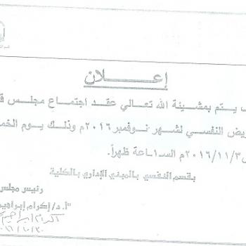 By God willing, meeting of adult nursing department council chaired by Prof. Dr./ Zainab Abdul Latif Mohammed, Faculty Dean & Head of the Department, will be held on Thursday, 3/11/2016, in the…