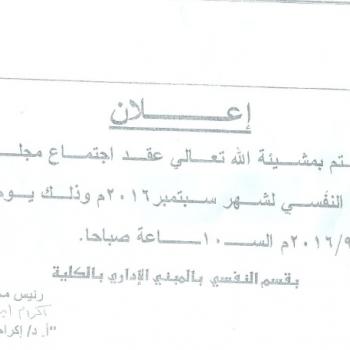 By God willing, meeting of psychiatric nursing department council chaired by Prof. Dr./ Ikram Ibrahim Mohamed, Head of the Department, will be held on Sunday, 4/9/2016, in the presence of teaching…