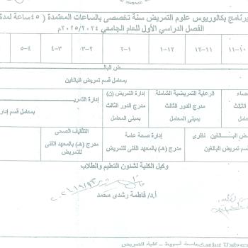 Academic schedule for the Bachelor of Nursing Sciences program, one year of specialization, with credit hours (45 hours for a full year), the first semester of the academic year 2024/2025 AD
