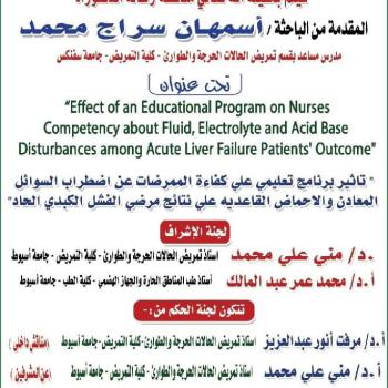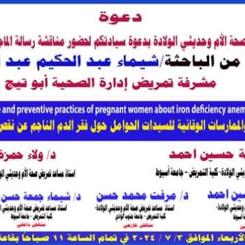 Acceptance of the master’s thesis of researcher Shaima Abdel Hakim Abdel Fattah, nursing supervisor in the health administration in Abu Tig, Assiut. The researcher's master's thesis has been accepted,