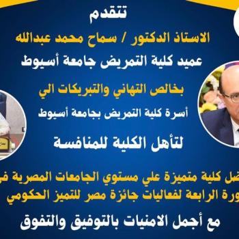 Professor Dr. Samah Mohamed Abdullah, Dean of the College, extends his heartfelt congratulations to the family of the Faculty of Nursing, Assiut University, for qualifying the College to compete as the best distinguished college at the level of Egyptian