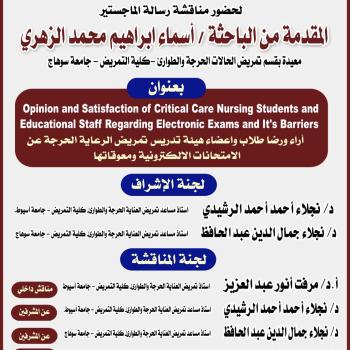 With pictures The master’s thesis of the researcher/Asmaa Ibrahim Muhammad Al-Zuhri, Faculty of Nursing, Sohag University, received an excellent grade. The researcher's master's thesis has been obtained