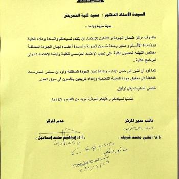 The family of the Faculty of Nursing at Assiut University, headed by Professor Dr. Samah Mohamed Abdullah, Dean of the Faculty, extends its most heartfelt congratulations. To Mrs. Professor Dr. Fatima Ahmed Abed for the issuance