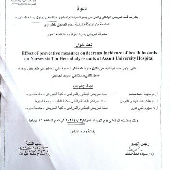 Allah willing, the master’s thesis protocol for the researcher/ Shadia Muhammad Al-Sadiq Khadrawi, nursing supervisor at the Central Administration for Infection Control, will be discussed.