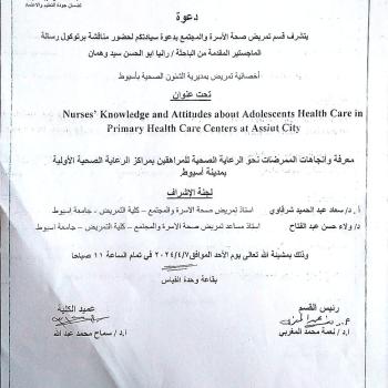 Allah willing, the master’s thesis protocol for researcher Rania Abu Al-Hassan Sayed Wahman, a nursing specialist at the Directorate of Health Affairs in Assiut, will be discussed.