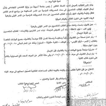 Announcement to students enrolled in the Takaful and Karama program: Please go to the Student Aid Office to register your names by October 30, 2025.