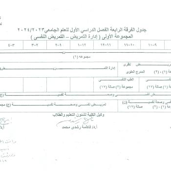 Fourth year schedule for the first semester of the academic year 2023/2024 AD, second group (Nursing Administration - Psychiatric Nursing)