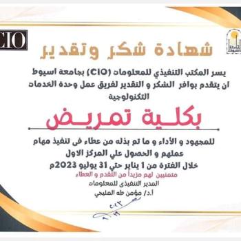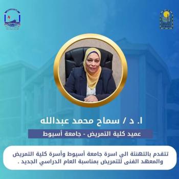 Mr. Prof. Dr. Samah Mohamed Abdullah, Dean of the College, extends his warmest congratulations to the Assiut University family, the Faculty of Nursing family, and the Technical Institute of Nursing family on the occasion