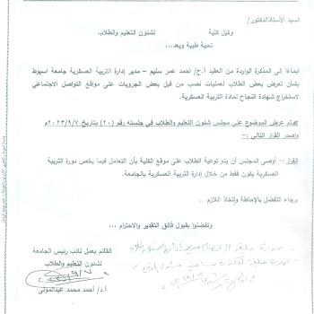 The memorandum received from Colonel A.H. Ahmed Omar Selim, Director of the Military Education Department, regarding the exposure of students to a scam by some groups.