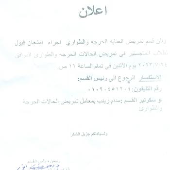 Important Announcement: The Critical Care and Emergency Nursing Department announces that an admission exam will be held for Masters students in Critical and Emergency Nursing on Monday, 7/24/2023 AD at 11 am