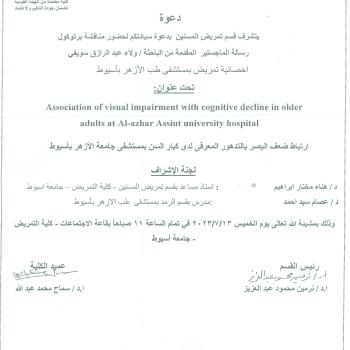 God willing, the protocol for the master's thesis of the researcher/ Walaa Abdel-Razek Souefi will be discussed,Nursing specialist at Al-Azhar Hospital, Assiut Title
