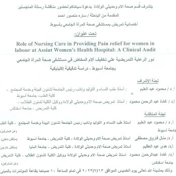 God willing, the master's thesis of the researcher / Sarah Mansour Ahmed will be discussed, Nursing specialist at Women's Health University Hospital in Assiut Title