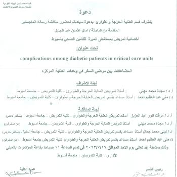 God willing, the master's thesis of the researcher / Amal Othman Abdel Jalil will be discussed ,Nursing specialist at Al-Mabara Hospital for Health Insurance in Assiut