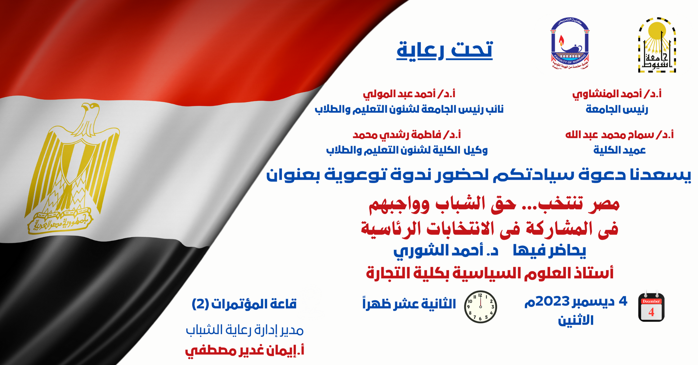 Under the patronage of Professor Dr. Ahmed Al-Minshawy, President of the University, Professor Dr. Samah Muhammad Abdullah, Dean of the College, Professor Dr. Fatima Rushdi Muhammad, Vice Dean of the College for Education and Student Affairs, Mr. Iman Ghadeer Mustafa, Secretary-General of the College, the Department Heads, the Director of Departments, and representatives from the students of the four teams participated in the symposium activities. Awareness (Egypt elects) to enhance the culture of political participation for young people, as the symposium comes within the framework of the university’s keenness to spread political awareness and enhance participation in electoral elections.
