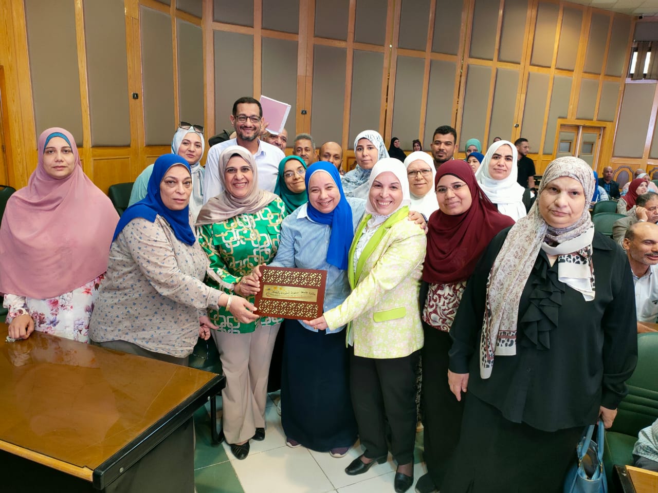 Today, Professor Dr. Fatima Rushdi Mohamed, Dean of the Faculty, was honored during a ceremony organized by the University's Administrative Development and Quality Unit, under the patronage of Professor Dr. Ahmed El-Menshawy, President of the University. The ceremony was attended by: