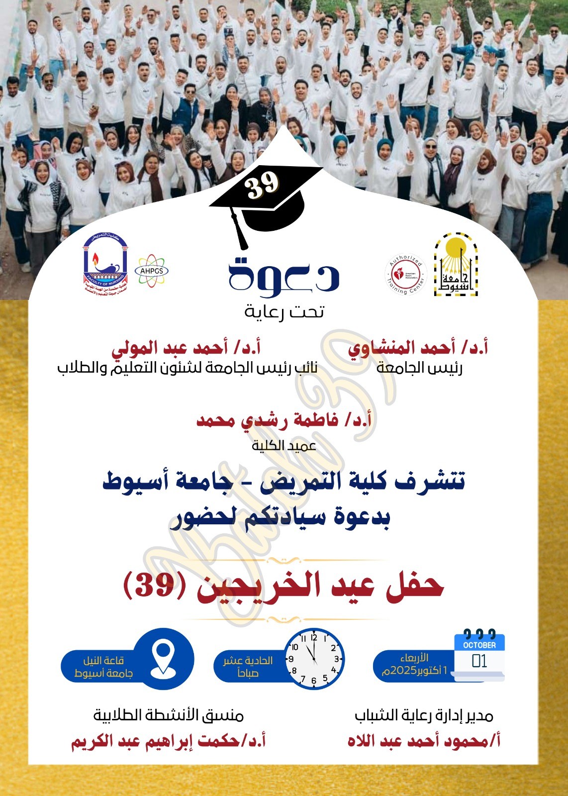and Professor Dr. Ahmed Abdel-Mawla, Vice President for Education and Student Affairs, and under the leadership of Professor Dr. Fatima Roshdy Mohamed, Dean of the College, with the participation of the Student Welfare Department. We are honored to invite you to attend the 39th Graduation Ceremony in the Nile Hall at the University on Wednesday, October 1st, at 10:00 AM. Your presence will be a pleasure.