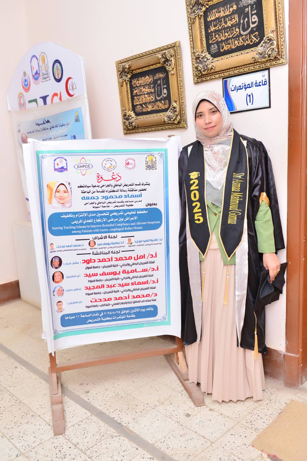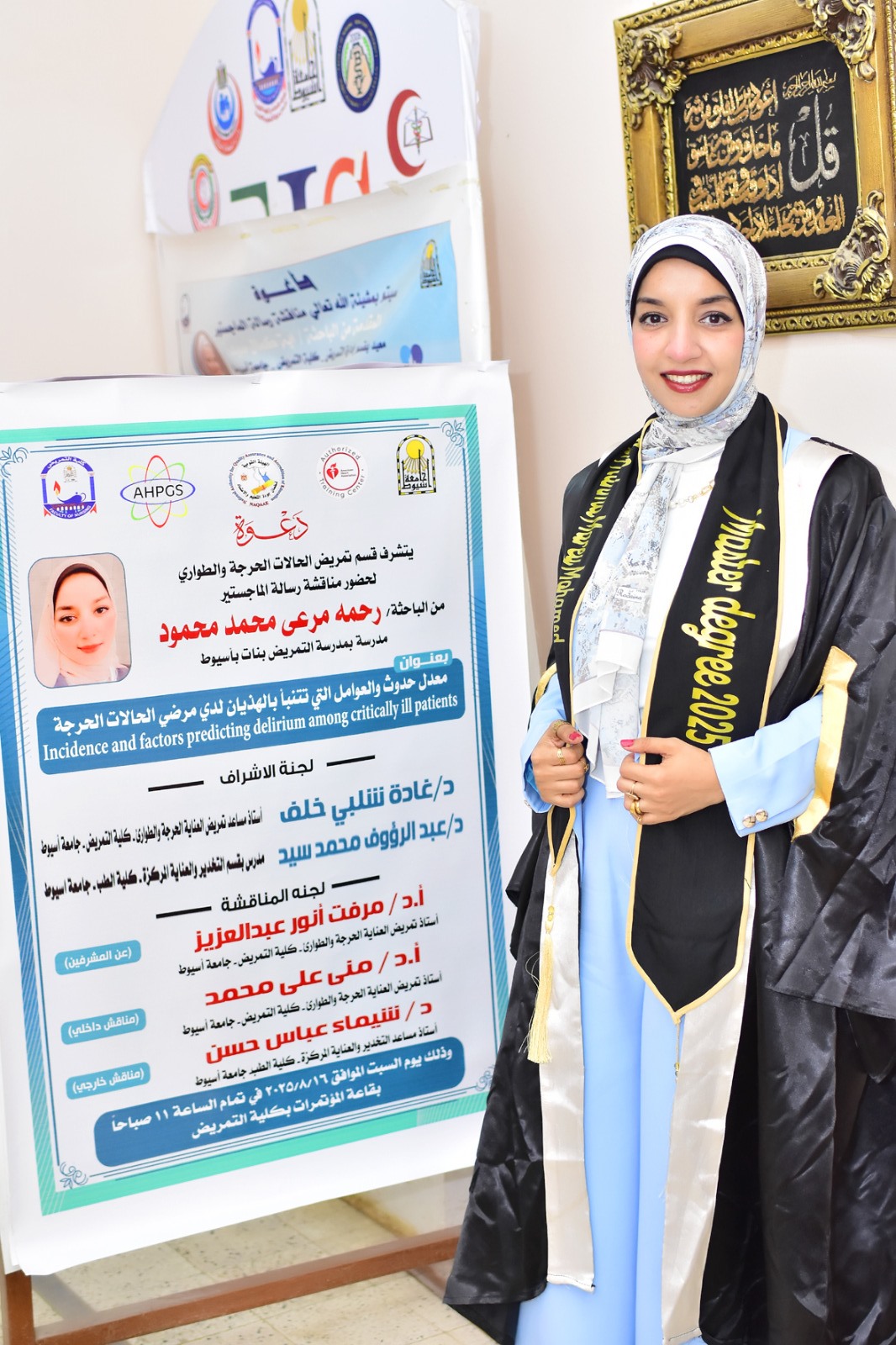 Congratulations on the Acceptance of the Master's Thesis The Faculty of Nursing at Assiut University extends its heartfelt congratulations to researcher Rahma Marai Mohamed Mahmoud, Teacher at the Girls’ Nursing School in Assiut,