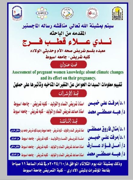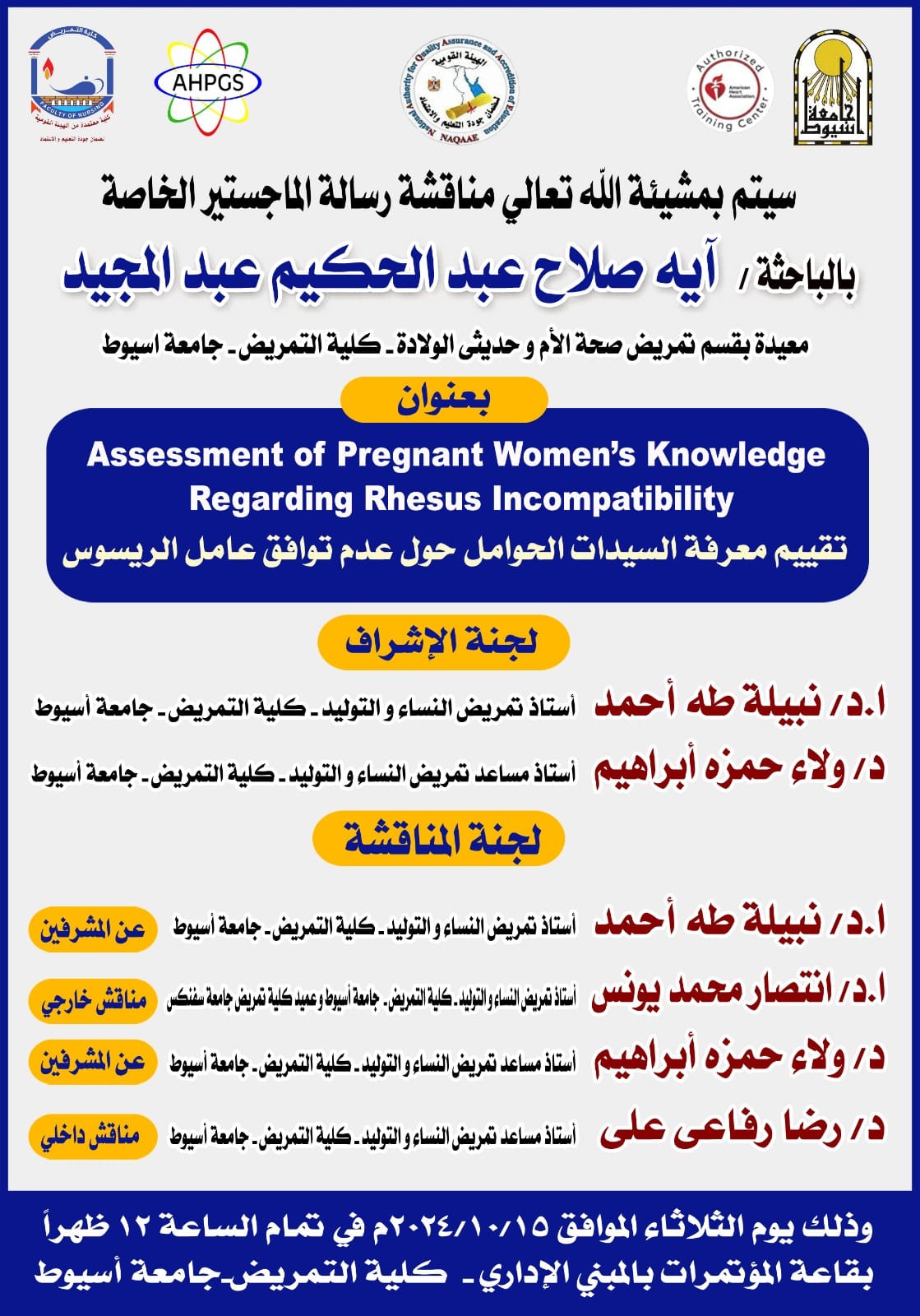 Acceptance of a private master's thesis By researcher: Nada Alaa Qutb Farag, teaching assistant, Department of Maternal and Newborn Health Nursing, Faculty of Nursing, Assiut University