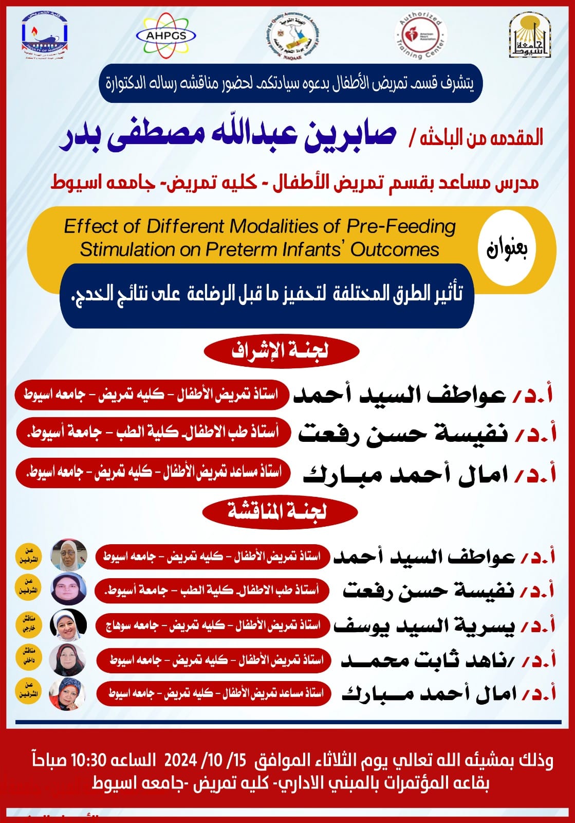 Acceptance of a doctoral dissertation Private researcher/ Sabreen Abdullah Mustafa Badr Assistant Lecturer in Pediatric Nursing, Faculty of Nursing - Assiut University The title of the submitted message: