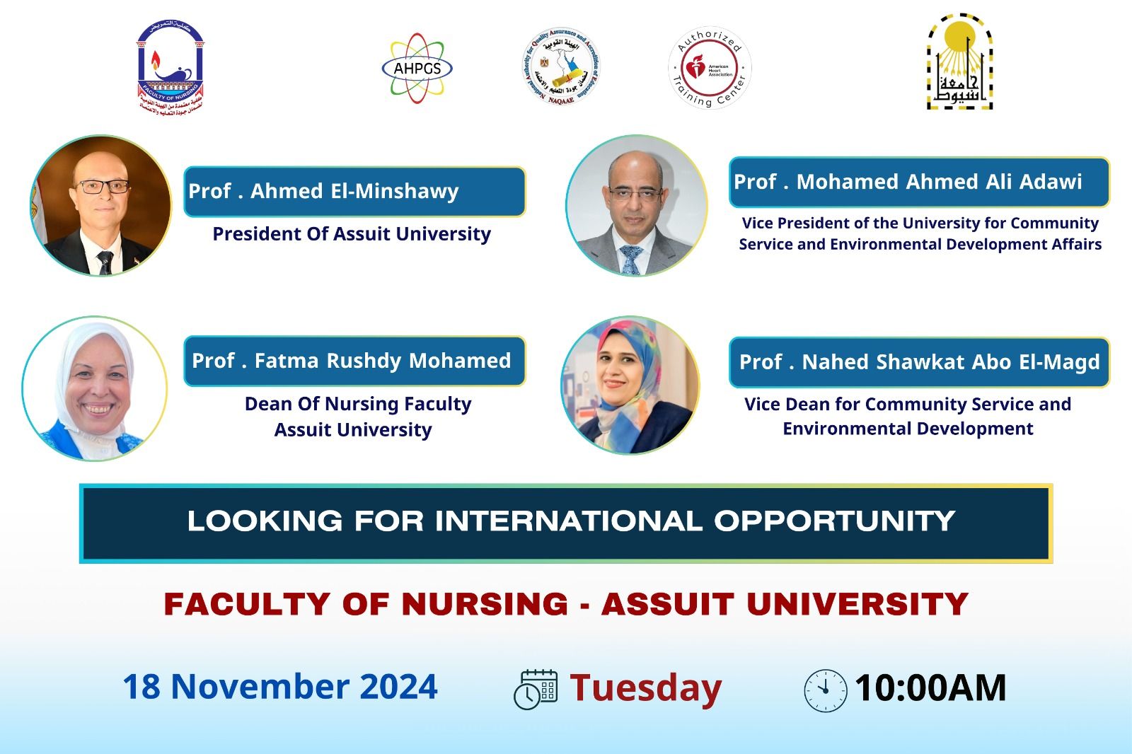 International accreditation in Assiut University. Dr. Al-Manshawi announces the renewal of the accreditation of the International Training Center in the Faculty of Nursing of the American Heart Association (AHA) for three years.