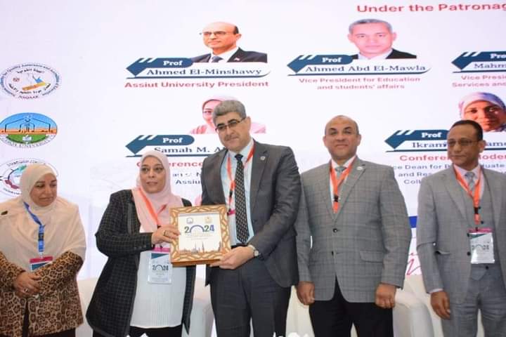 On the sidelines of the conference; Shields were presented to: Dr. Ahmed El-Minshawy, President of Assiut University, Dr. Mahmoud Abdel-Aleem, Dr. Gamal Badr, Dr. Mahmoud Shiha, Dr. Samah Abdullah, and Dr. Nidal Farid Aisha, honoring the deans of the Faculty of Nursing, and honoring a group of faculty members. In the college, the college secretary and the former secretary, a number of college administrators, graduates of the first batch of the college of nursing since its inception, some from the Directorate of Health Affairs, and the Police Hospital in Assiut, and honoring the sub-head of the nursing union in the Assiut Nursing Syndicate. Dr. Nidal Farid Aisha also presented the Zarqa University shield to the college of nursing. Assiut University.