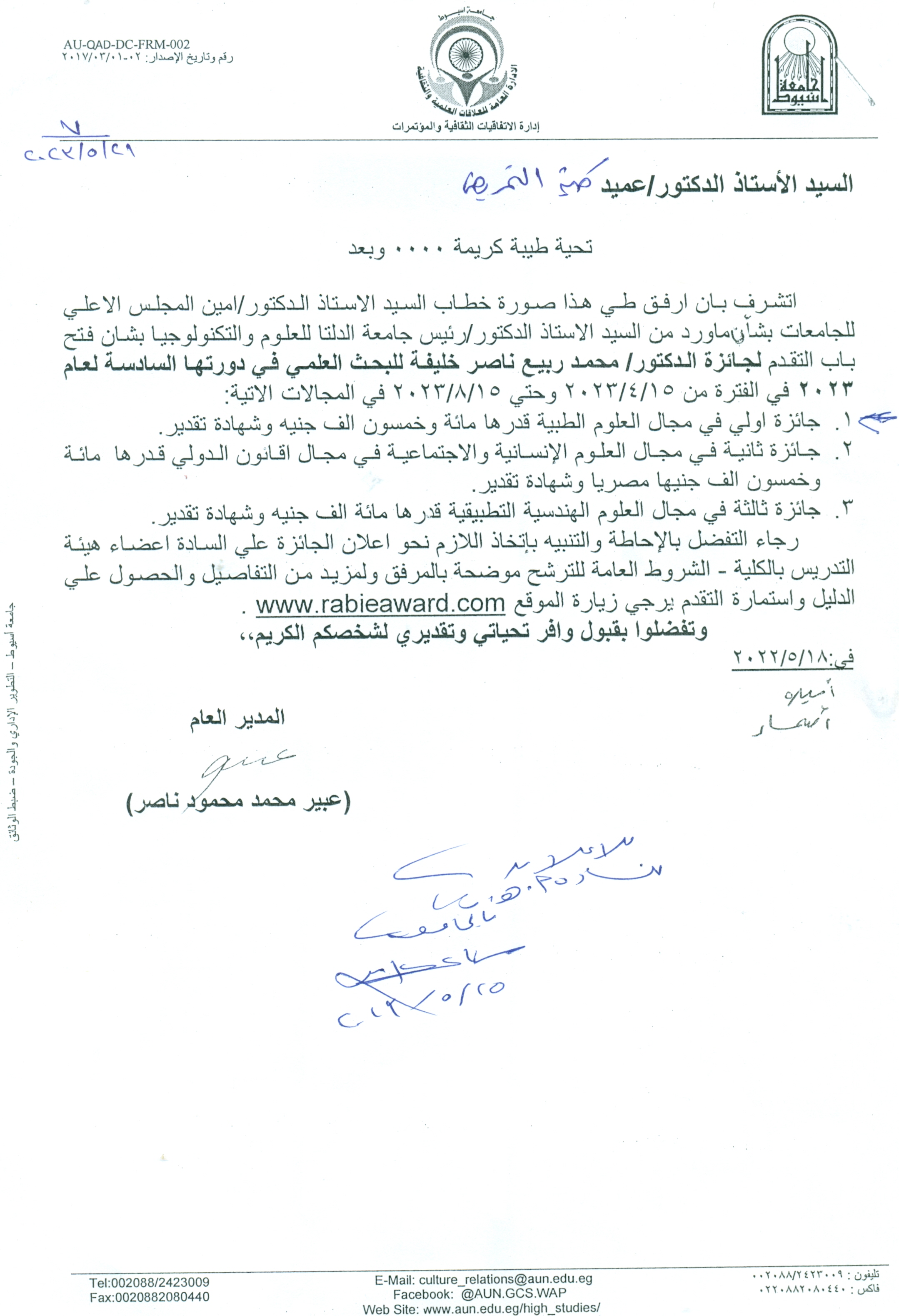 Opening to apply for the Dr. Muhammad Rabih Nasser Khalifa Award for Scientific Research is opened in its sixth session for the year 2023 AD 28 May 2023