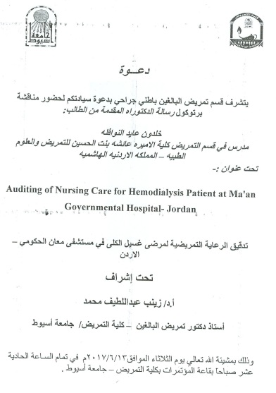 By God willing, the protocol of doctoral thesis submitted by researcher/ Khaldoon Ayed Alnawaflh – Lecture, Nursing Department, Princess Aisha Bint Alhussein College of Nursing & Health Sciences, Al-Hussein Bin Talal University, Jordan, will be discussed on Tuesday, 13/6/2017, at 11:00 a.m., at the conference hall of the college.