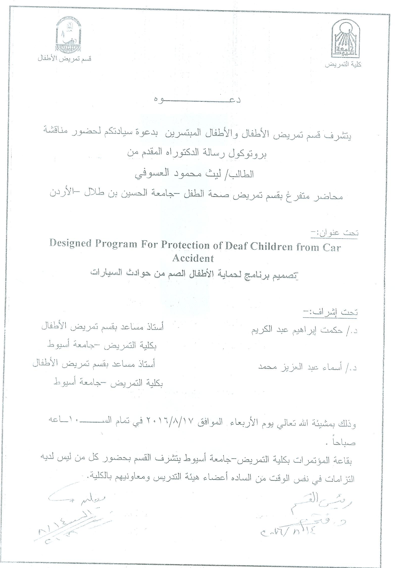 By God willing, doctoral thesis submitted by researcher/ Laith Mahmoud Alasovi - Pediatric Nursing, Al-Hussein Bin Talal University, Jordan - will be discussed on Wednesday, 17/8/2016, at 10:00 a.m., at the conference hall of the college.