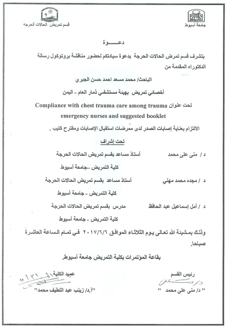 By God willing, the protocol of doctoral thesis submitted by researcher/ Mohamed Mossad Ahmed Hassan El-Gabry – Nursing Specialist, Thamar Hospital, Yemen, will be discussed on Tuesday, 6/6/2017, at the conference hall of the college.