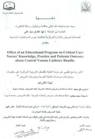 By God willing, the protocol of doctoral thesis submitted by researcher/ Noha Othman Sayed Ali – Nursing Specialist, will be discussed on Wednesday, 21/12/2016, at 12:00 noon, at the conference hall of the college.