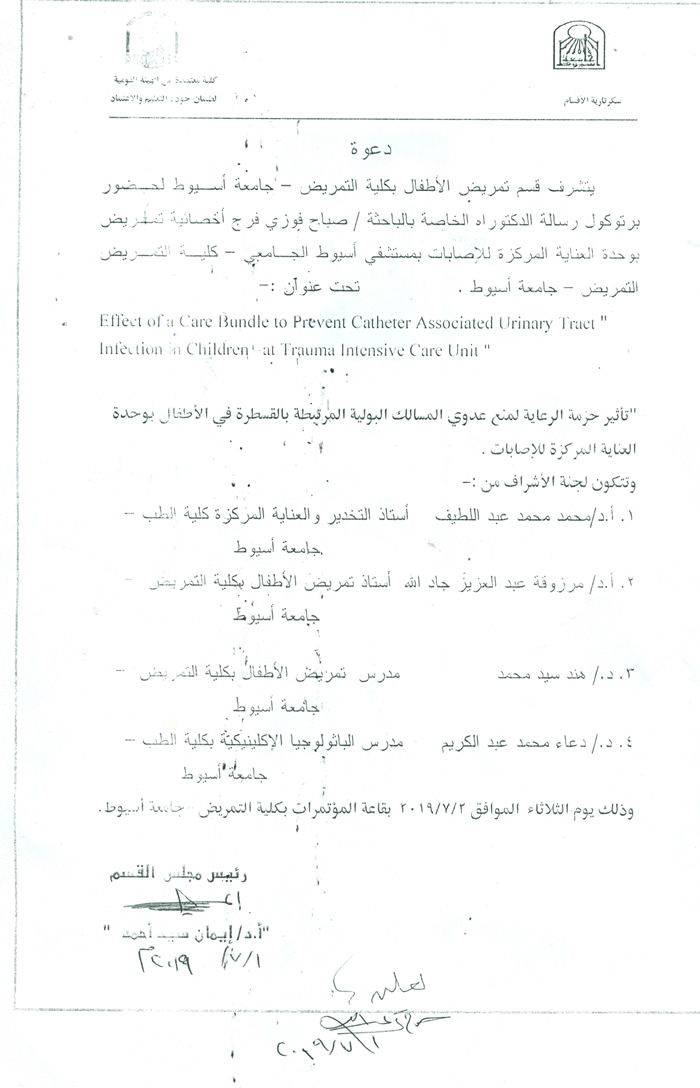By God willing, protocol of doctoral thesis submitted by researcher/ Sabah Fawzy Farag will be discussed on Tuesday, 2/7/2019, at the conference hall of the college.