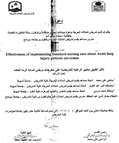 By God willing, the protocol of doctoral thesis submitted by researcher/ Safaa Mohamed Adam - assistant lecturer, Critical Care Nursing Department, Faculty of Nursing, Sohag University- will be discussed on Sunday, 8/10/2017, at 12:00 noon, at the conference hall of the college.