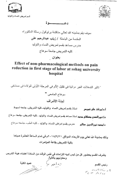 By God willing, the protocol of doctoral thesis submitted by researcher/ Zaynab Abdel Rheem Ali - assistant lecturer, Gynecology and Obstetrics Nursing Department, Faculty of Nursing, Sohag University- will be discussed on Wednesday, 21/2/2018, at 10:00 a.m., at the conference hall of the college.