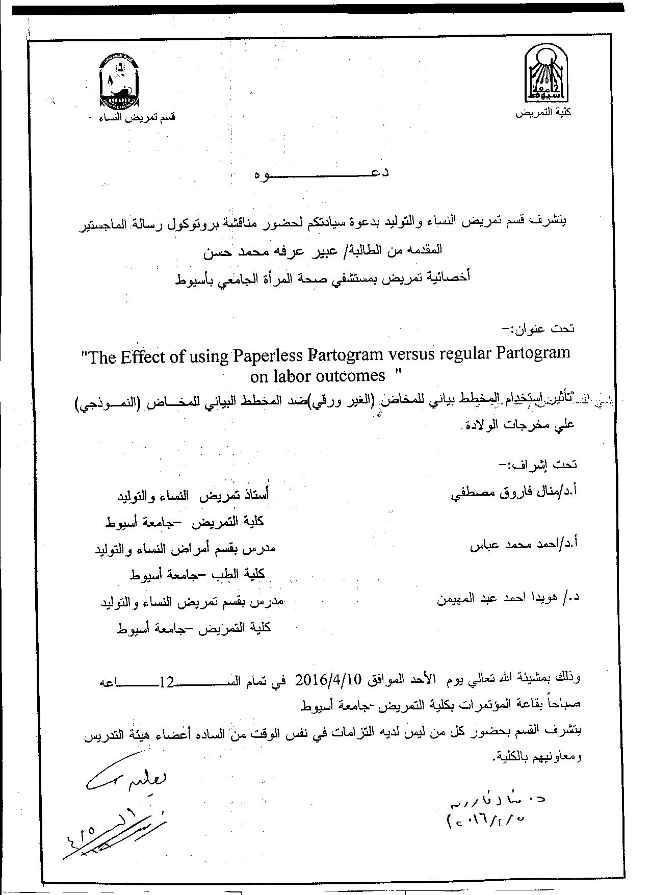 By God willing, The protocol of master thesis submitted by researcher/ Abeer Arafa Mohamed Hassan - Nursing specialist, Assiut Women's Health Hospital - will be discussed on Sunday, 10/4/2016, at 12:00 noon, at the conference hall of the college.