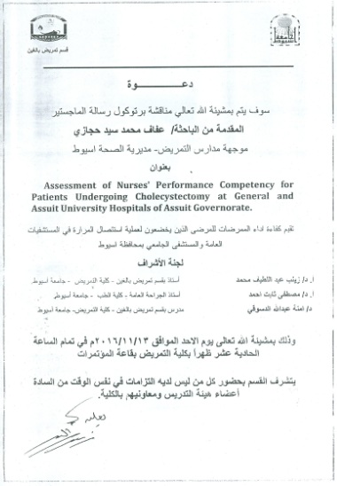 By God willing, The protocol of master thesis submitted by researcher/ Afaf Mohammed Sayed Hegazy will be discussed on Sunday, 13/11/2016, at 11:00 a.m., at the conference hall of the college. Thesis Title: " Assessment of nurses' performance competency for patients undergoing cholecystectomy at general and Assiut University Hospitals of Assiut Governorate "