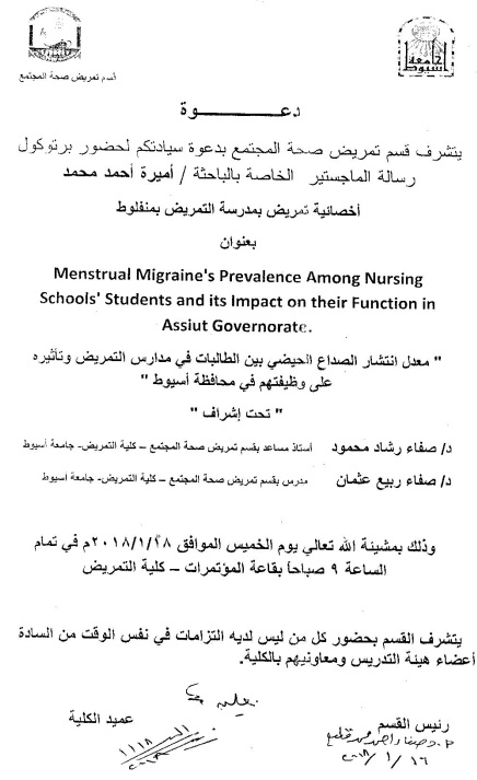 By God willing, the protocol of master thesis submitted by researcher/ Amira Ahmed Mohamed, Nursing Specialist, will be discussed on Thursday, 18/1/2018, at the conference hall of the college.