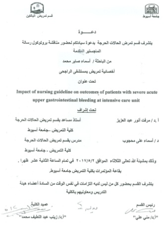 By God willing, the protocol of master thesis submitted by researcher/ Asmaa Saber Mohamed – Nursing Specialist, will be discussed on Tuesday, 2/5/2017, at the conference hall of the college.