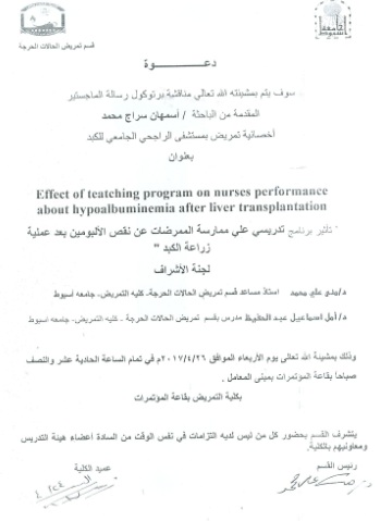 By God willing, the protocol of master thesis submitted by researcher/ Asmahan Siraj Mohamed – Nursing Specialist, will be discussed on Wednesday, 26/4/2017, at the conference hall of the college.