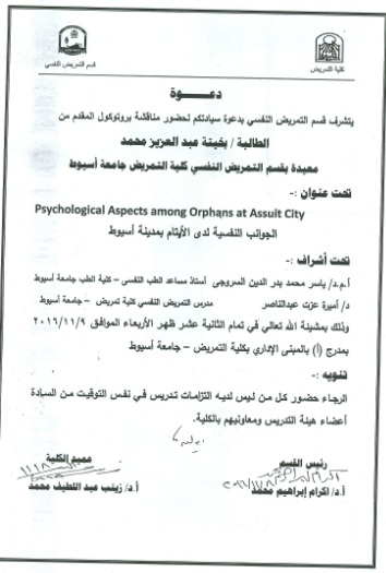 By God willing, The protocol of master thesis submitted by researcher/ Bakheeta Abd El- Aziz Mohammed Ahmed - demonstrator, Psychiatric Nursing department, Faculty of Nursing, Assiut University - will be discussed on Wednesday, 9/11/2016, at 12:00 noon, at the conference hall of the college.